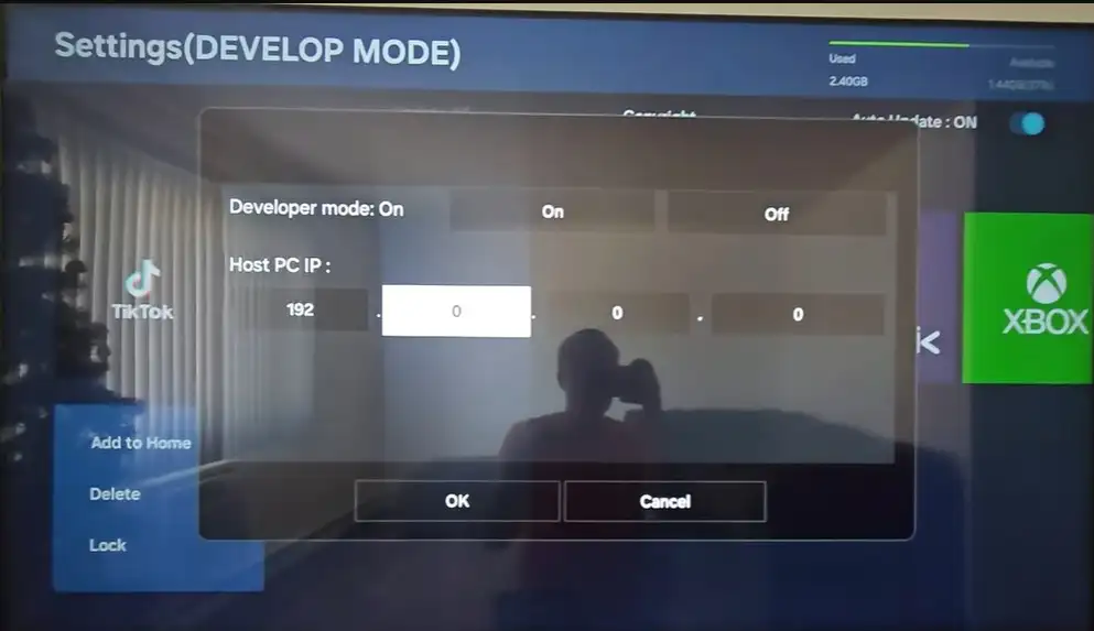 За да активирате режима за разработчици, изпълнете следните стъпки. Отворете раздел „Приложения“ на телевизора и отидете на екрана на магазина за приложения. Влезте в настройките. Когато се появи полето за въвеждане на цифри, въведете с дистанционното последователността 1, 2, 3, 4, 5. Ще се отвори менюто „Режим за разработчици“. В зависимост от версията на операционната система полето за въвеждане може да се различава при някои модели телевизори. Трябва да натиснете бутона на дистанционното, който показва цифрите на екрана на телевизора, след което числата ще се появят на екрана и трябва да ги изберете последователно от 1 до 5.