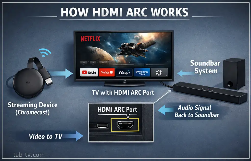 HDMI ARC или eARC се използва за предаване на звук от телевизора към външни аудио устройства, като саундбарове. Ако тази функция не е необходима, портът може да се използва като стандартен HDMI порт.