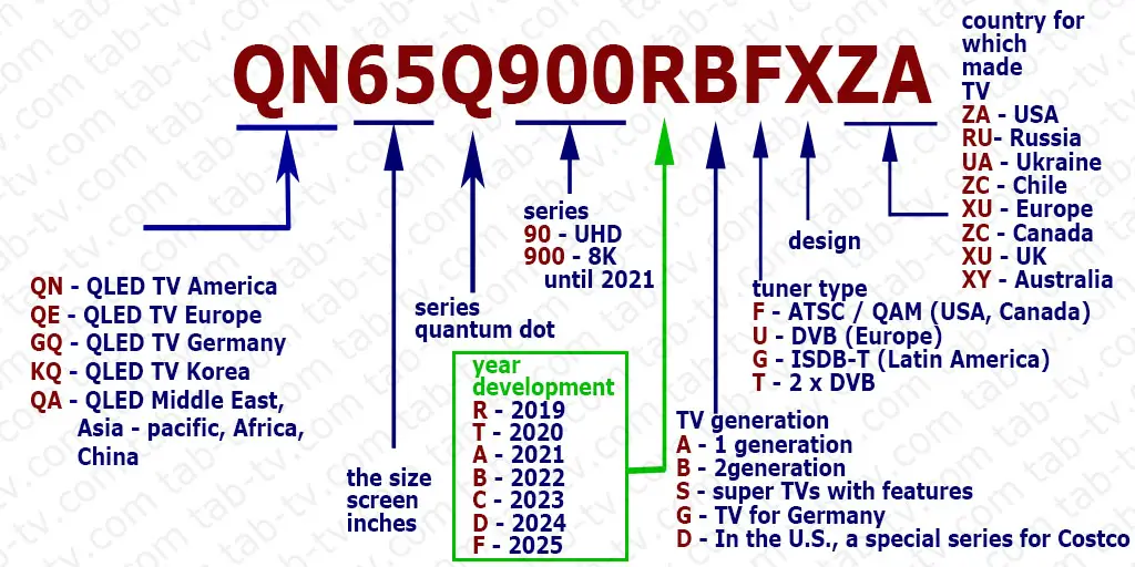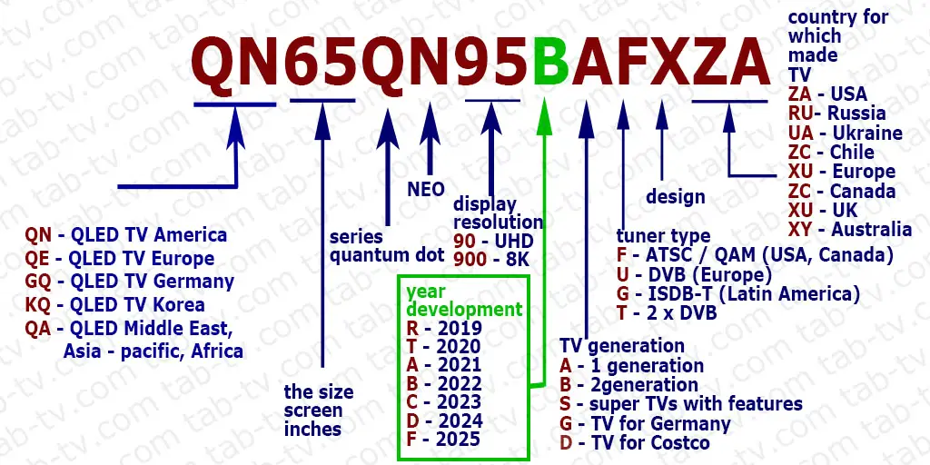 Neo QLED 및 QLED TV의 모델 번호는 동일하며, 유일한 차이점은 QLED 또는 NEO QLED TV를 나타내는 글자입니다. 2017-2018년에 출시된 이러한 TV의 첫 번째 모델은 약간 다른 모델 번호 구조를 가지고 있었으며, 이 점에 대해 아래에서 자세히 설명하겠습니다.