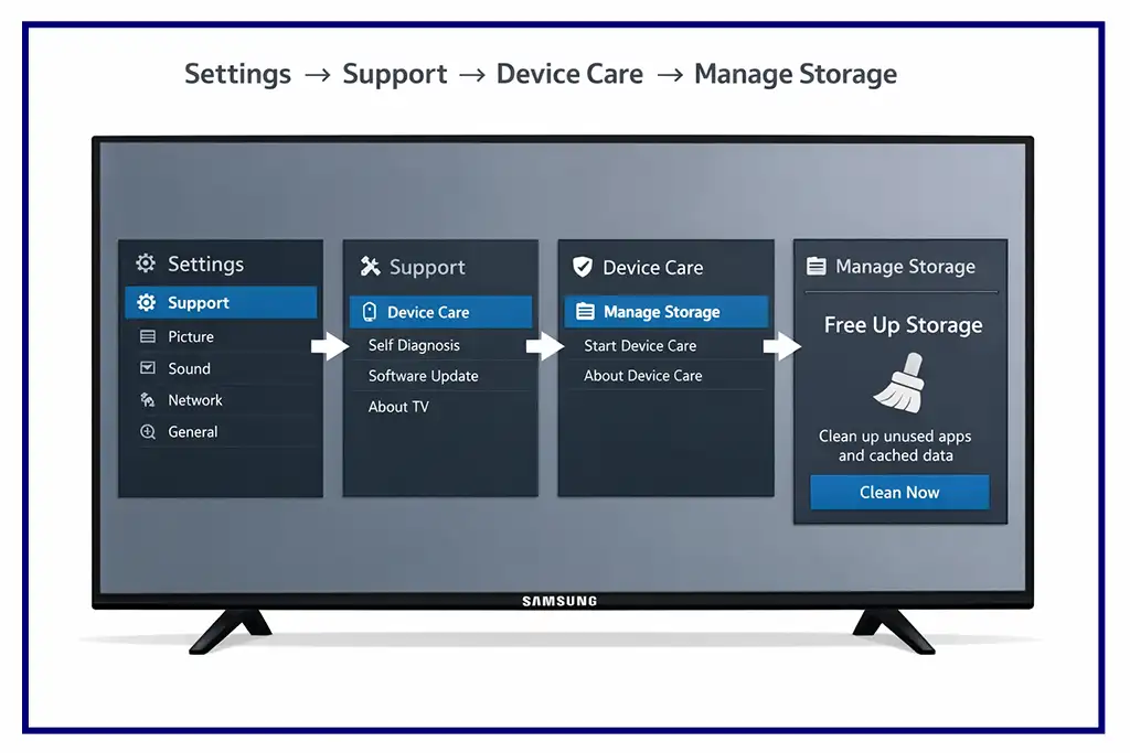 Pomanjkanje pomnilnika na televizorjih Samsung je razmeroma redko. Pri modelih, izdelanih pred letom 2020, sistem občasno samodejno odstrani nepotrebne podatke, vendar ta funkcija na starejših televizorjih ni bila vedno dobro optimizirana. Vgrajeni brskalnik je pogosto glavni vir shranjenih podatkov, saj v trajni pomnilnik televizorja shranjuje informacije o obiskanih straneh.