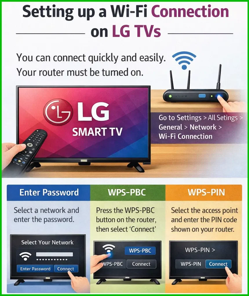 Danes je skoraj vsakdo vajen uporabe interneta, povezava z Wi-Fi omrežjem pa je postala običajna. Vsi sodobni LG TV-ji podpirajo tako žično kot brezžično internetno povezavo. Nastavitev je precej enostavna in ne zahteva posebnega znanja. Edina opomba je, da se lahko postopek nastavitve razlikuje glede na leto modela televizorja zaradi sprememb v operacijskem sistemu.