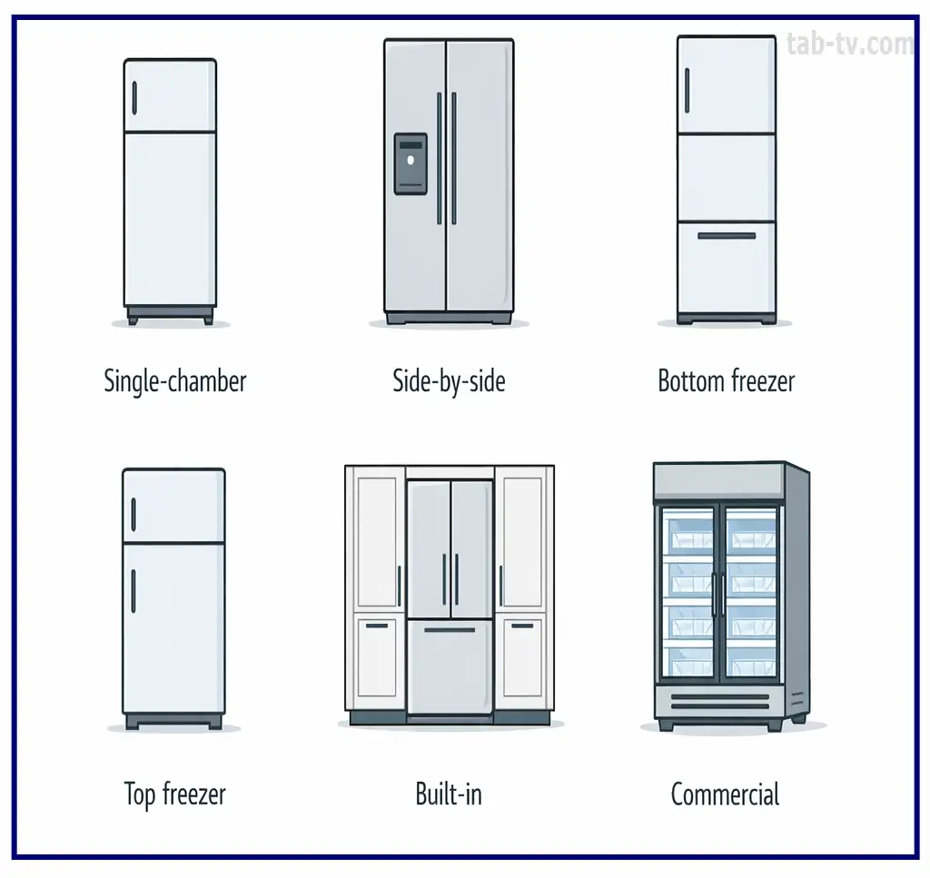 Jednokomorové modely sú kompaktné a majú malú mrazničku. Side-by-side modely majú chladničku a mrazničku usporiadané vertikálne, ponúkajú veľkú kapacitu a obsahujú dávkovače vody a ľadu. Praktickejším riešením je chladnička s mrazničkou dole a hlavným oddelením vo výške očí. Modely s hornou mrazničkou sú klasické, ale tento dizajn sa dnes považuje za zastaralý, hoci takéto chladničky sa stále vyrábajú. Vstavané chladničky sa inštalujú do kuchynských skriniek; sú pomerne bežné a niektorí výrobcovia, ako Samsung, majú celé produktové rady takýchto zariadení.
